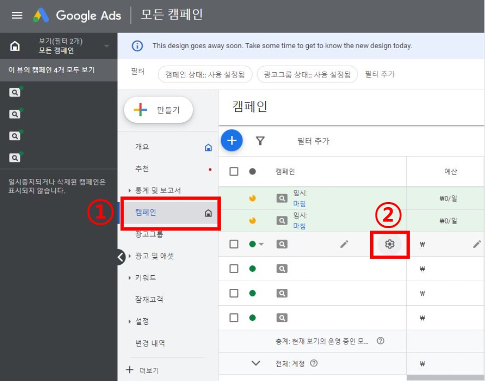 1-1) '캠페인 설정' 들어가는 첫 번째 방법